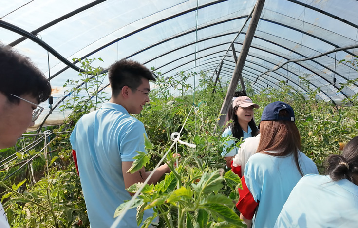 为深入了解乡村特色农业的发展现状,实践团深入田间地头,亲身感受大自然的磅礴力量和乡村产业的坚守与传承。实践团走进汤池村蔬菜大棚进行调研,大棚里的番茄、西瓜等果蔬长势喜人,师生们近距离观察它们的生长情况,并与当地农户深入交流。侯为民现场提出可创新学生劳动实践模式,邀请大学生参与后续种植、除草、管护、采摘等工作。这种模式既为大学生提供了劳动实践平台,将理论知识应用于实际,又为乡村产业发展补充了人力,实现了校地双向赋能、共同发展。