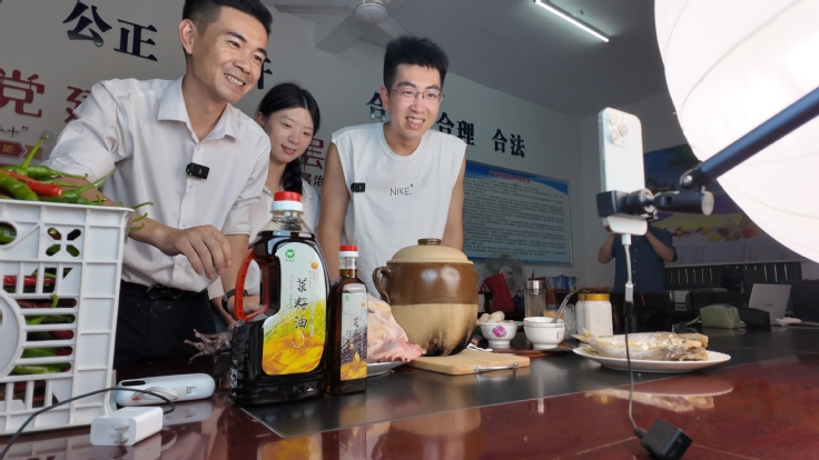 活动期间,实践团充分发挥专业优势,在汤池村设立助农直播间。青年主播们化身乡村好物推荐官,现场推介当地特色农产品,如薄皮青椒、板栗林下生态养殖的跑山鸡、小河鱼、山芋粉及葛根粉等。他们生动展示这些农产品的生态种养特点和品质优势,吸引众多网友关注下单。这场持续三小时的直播活动,不仅直接带动了特色农产品的销量,实实在在拓宽了乡亲们的增收渠道,更让实践团成员亲身参与到乡村振兴的生动实践中,用青春的智慧和力量为当地特色产业发展“云”助力。
