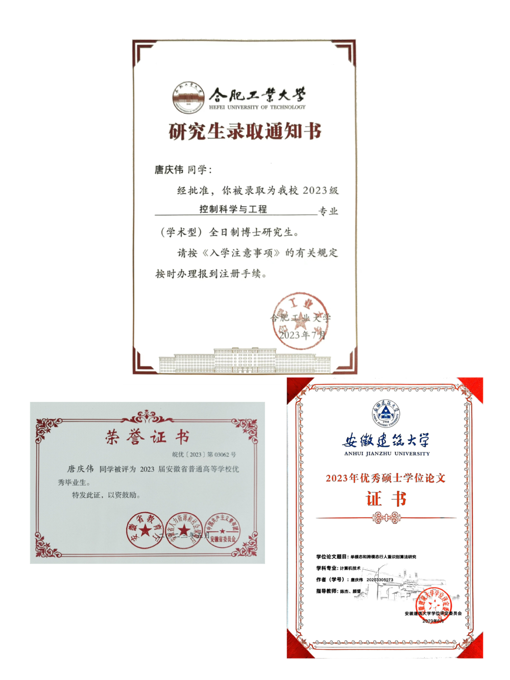 热烈庆祝我中心唐庆伟同学获得2023届安徽省普通高等优秀毕业生和必赢76net线路官网2023年优秀硕士学位论文。同时被合肥工业大学控制科学与工程录取学术型博士研究生。