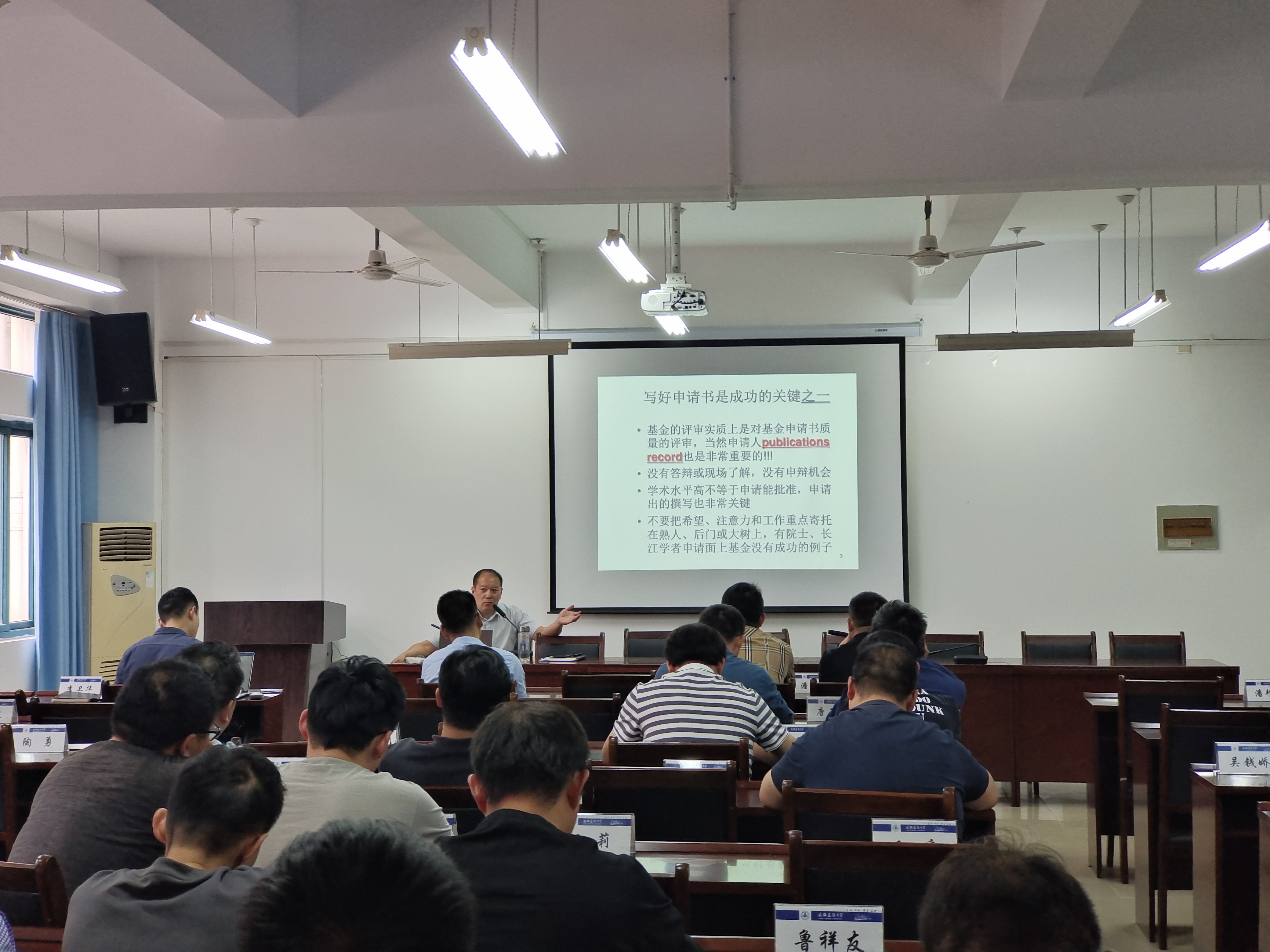 谢发之首先介绍了学校和兄弟高校近几年国家自然基金项目申报与立项情况,针对学院2022年国家自然科学基金申报项目的函评专家反馈意见,梳理了当前老师们在申报国家自然科学基金项目工作中存在的问题,并提出改进意见和建议。随后,他结合个人申报经历,从申请书项目选题、摘要撰写、研究内容与研究目标的内在联系、研究基础的重要性等方面做了如何撰写国家自然科学基金项目申请书的辅导报告,他希望老师们要进一步聚焦自己的科研方向,强化研究基础,凝练关键科学问题,不断提升创新能力水平,勇当学校科技创新的生力军。