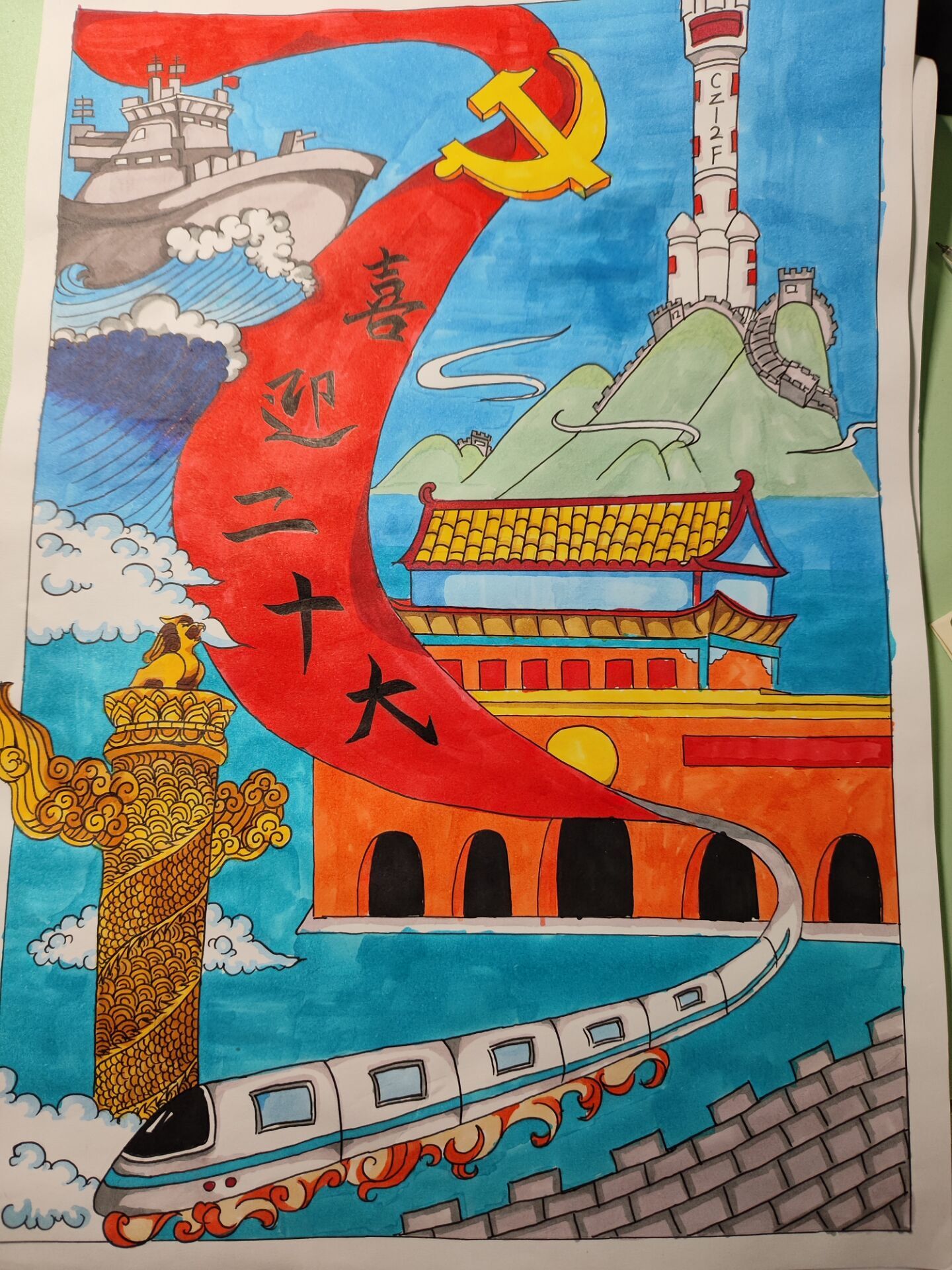 为配合学校疫情防控相关要求,本次比赛全程线上进行。同学们积极参与、潜心创作,以书言志,礼赞党的丰功伟绩;以画传情,讴歌伟大新时代。在参与线上评比的14份作品中,和平鸽、祥云等象征着美好意愿的元素跃然纸上,中国版图、人民英雄纪念碑等红色元素层出不穷。最终,22级给排水专业的陈芷妍同学的作品《绮丽绚烂》,获得了环能学子一致好评,在线上投票中夺得桂冠。
