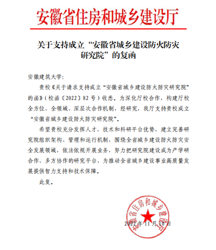 本网讯 近日,安徽省住房和城乡建设厅复函必赢,正式批准必赢成立“安徽省城乡建设防火防灾研究院”。