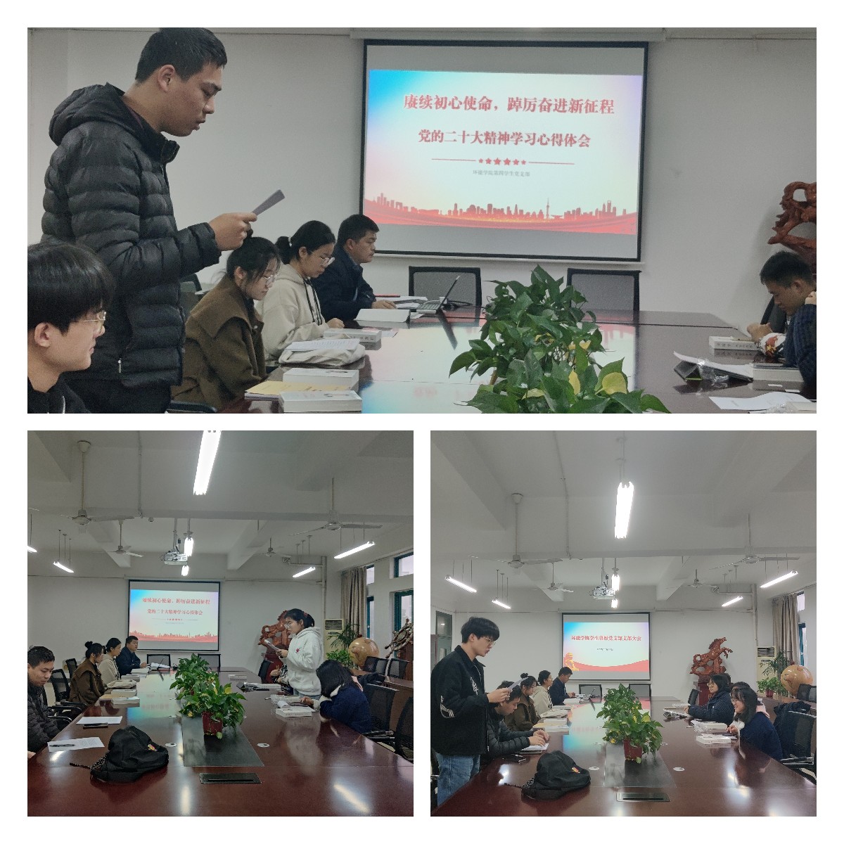 学理论之思,践初心之行。支部在党课学习后,开展了“赓续初心使命,踔厉奋进新征程”党的二十大精神学习心得交流会,支部党员纷纷做学习交流感想。马鑫鑫同学表示作为一名毕业班的学生党员,要立志做有理想、敢担当、能吃苦、肯奋斗的新时代好青年,把人生理想融入国家和民族事业,在不懈奋斗中实现自己的人生价值,在全面建设社会主义现代化国家的火热实践中绽放绚丽之花。预备党员单晓雪表示要把学习党的二十大精神作为提高党性修养、锤炼品德修养的必修课,坚定不移听党话、跟党走,成为不负时代、不负人民的新时代好青年。支部书记徐明露做了总结,要求支部全体党员要以党的二十大精神为指引,用党的最新理论成果武装头脑、指导实践,充分认识和牢记肩上担负的职责使命。