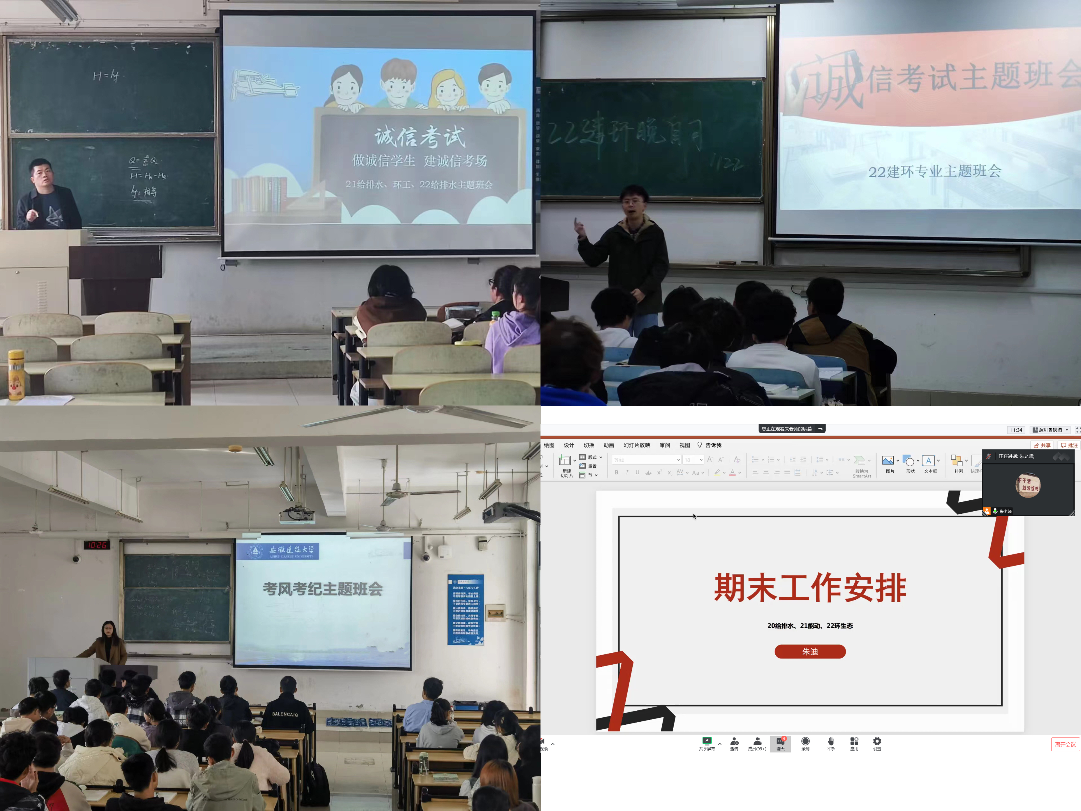 各年级辅导员走进班级、走进宿舍开展诚信考试宣讲,再次向同学们强调了考试要求,并结合以往案例要求广大同学严肃对待考试,认真考试、诚信做人。同时,在各场考试中,由学院领导带班,走进各班考场开展巡考。期末临近,各班级结合实际,召开了主题班会,就最新疫情防控形势和要求、学校近期教学考试安排、返程途中的乘车安全、寒假期间的安全注意事项、回家后的个人防护等工作作了详细的安排,提醒同学们要时刻关注自身安全,尤其要谨防电信诈骗,确保同学们一个平安祥和的新年。(作者:朱迪;审稿:戴前宏)