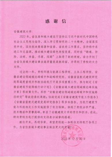 本网讯 近日,必赢收到安徽省住房城乡建设厅发来的感谢信,对学校过去一年在推动住房城乡建设事业高质量发展中做出的贡献以及展现出的优良工作作风和专业工作水准给予了高度肯定和赞扬。