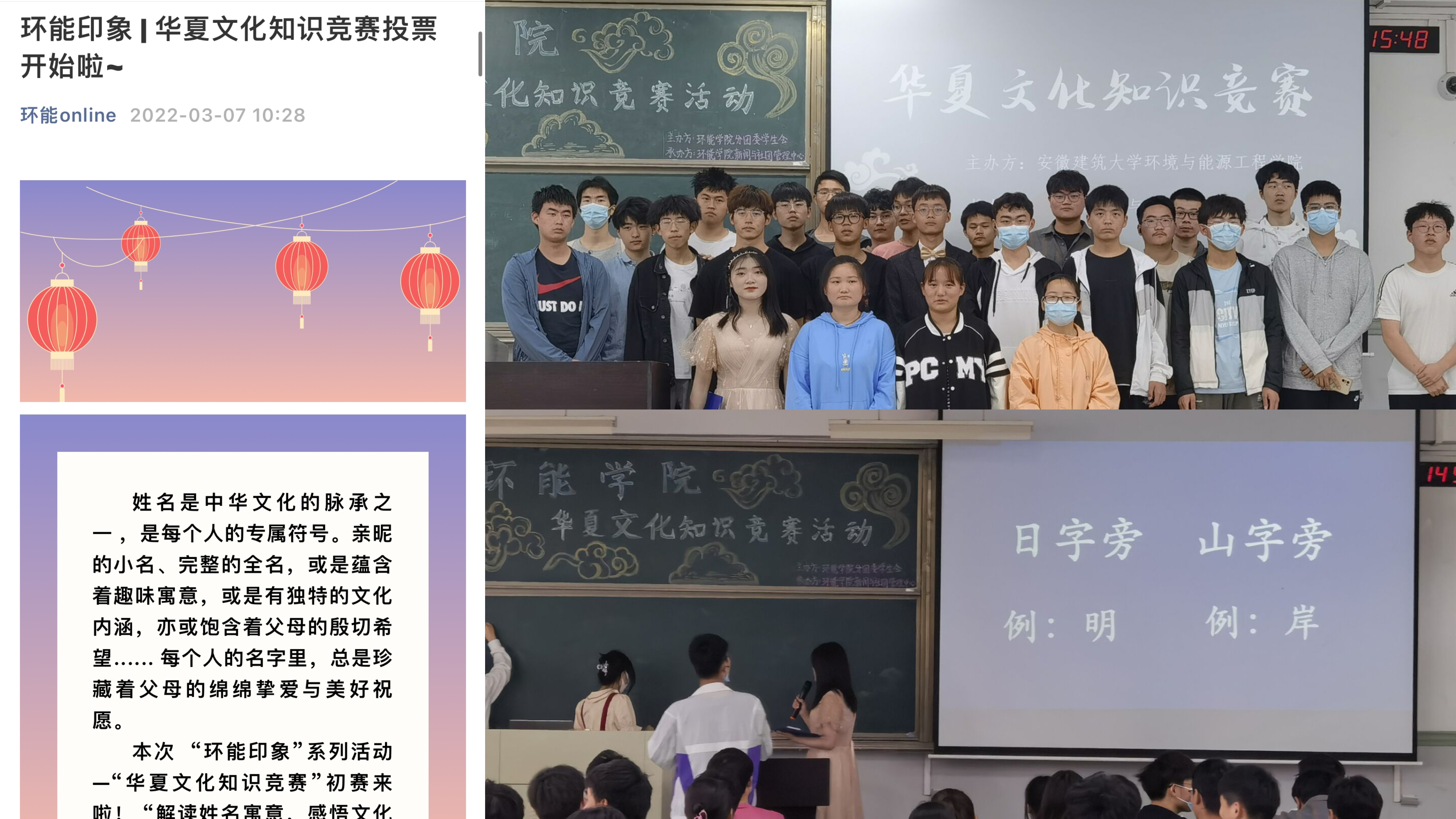 汉字是世界上历史最悠久的文字之一,是中华民族文化和智慧的结晶,是传承中华优秀传统文化的重要载体。3月初春时节,学院举办了为期两周的华夏文化知识竞赛,带领同学们一起发掘汉字之美。初赛中,参赛选手对个人真实姓名进行深度解读,名字中或是蕴含着出生当天的节气,或是出自于某首诗词,亦或饱含着父母的殷切希望,简单的名字深刻展现了汉字无与伦比的魅力;决赛中,通过汉字专项、成语专项、诗词专项等关卡来考验同学们的知识积累和灵活反应,选手们将浓厚的文学素养展现的淋漓尽致。本次华夏知识竞赛展现了环能学子对国学精粹的炽热之心,也彰显了中华传统文化的经典魅力。