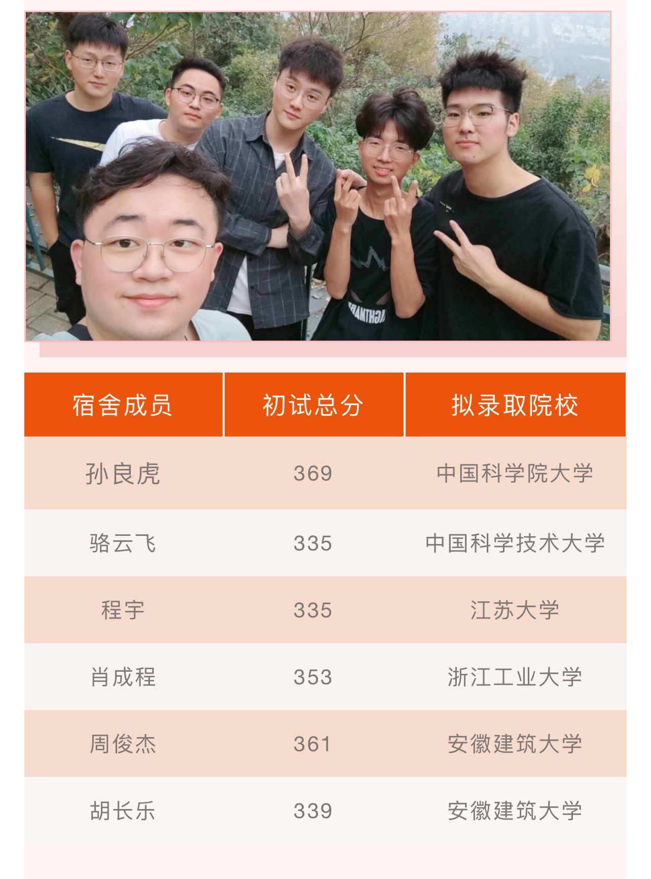 本网讯 继晷焚膏不倦眸,如流答问榜为酬。荧灯伴得潜心夜,洙泗迎来破浪舟。学问能从无尽取,风标但向有涯求。龙门一过朝宗去,指待云帆万里游。随着2023年研究生录取名单陆续公布,环能学院学子捷报频传,给排水科学工程专业8栋108寝室6名考研学子全部“上岸”,其中,骆云飞被中国科学技术大学录取,孙良虎被中国科学院大学录取,程宇被江苏大学录取,肖成程被浙江工业大学录取,胡长乐和周俊杰被必赢76net线路官网录取,求学路上再绽新风采!