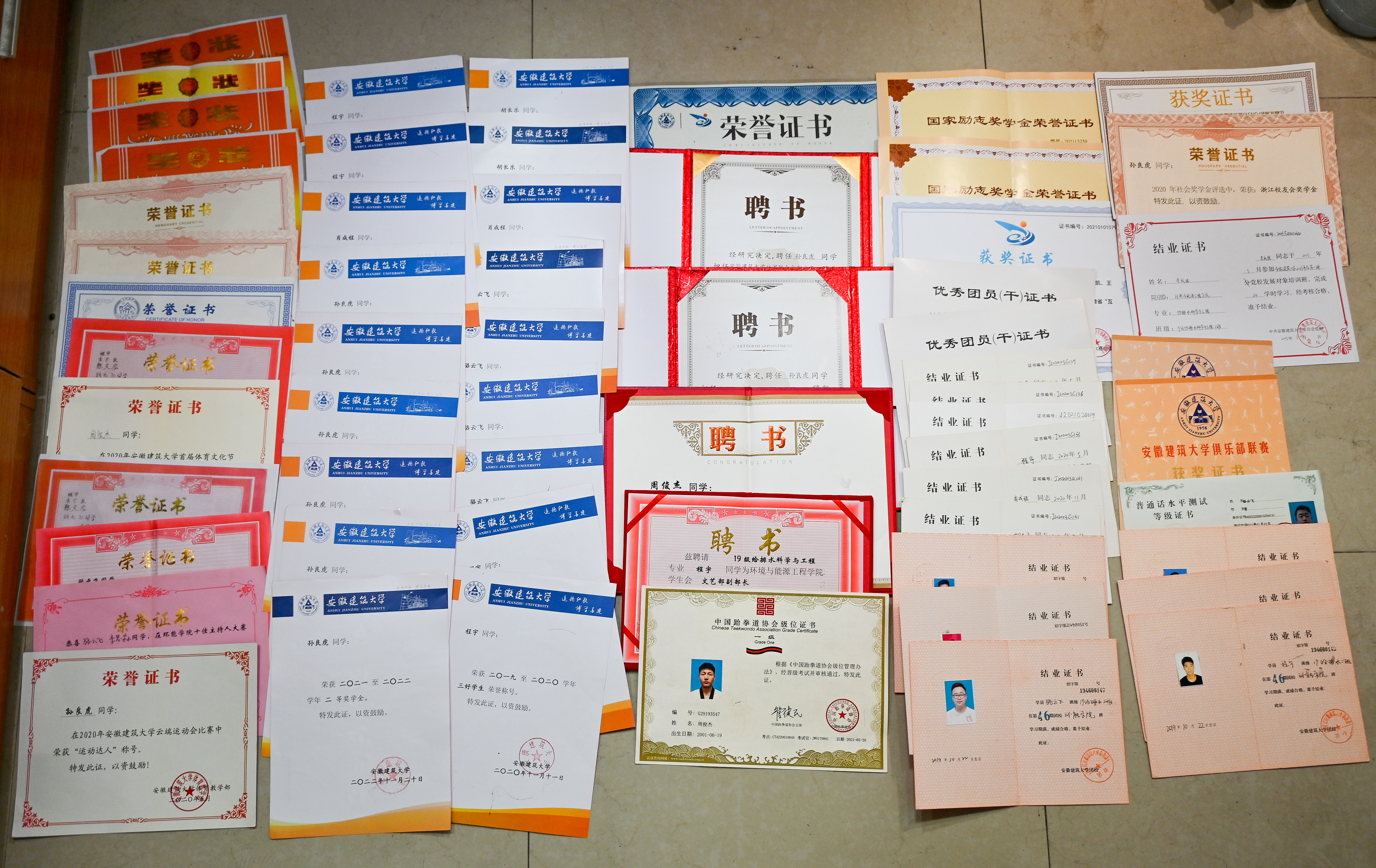 大学四年,六人留下的还有数不清的奖状和证书:2023年安徽省省级优秀毕业生、校级优秀毕业生、“互联网+”高校主赛道银奖、“深水杯”定向专题竞赛优秀奖、中骐-华旭杯省级一等奖、国家励志奖学金、校级奖学金、社会奖学金、三好学生、优秀学生干部、优秀团干、优秀团员、优秀志愿者……大学期间取得的证书和荣誉,几乎可以铺满整个宿舍的地面。