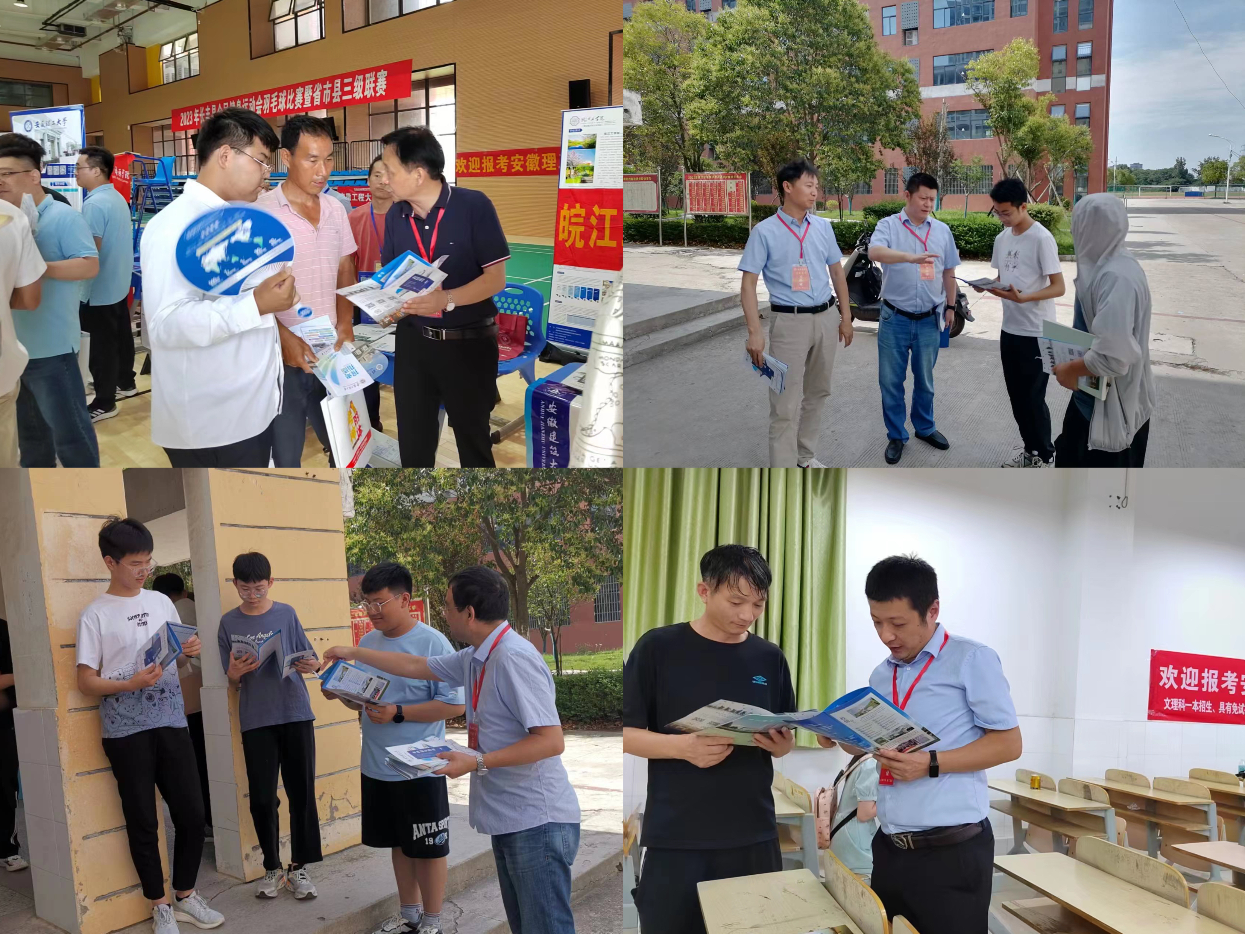 高考前夕,5月22日、6月4日学院党委书记戴前宏一行赴长丰衡安学校、长丰县第一中学进行招生宣传,6月3日学院院长谢发之赴安徽省定远中学、定远县第三中学、定远县第二中学、定远县英华中学开展招生宣讲,分别召开高三班主任座谈会,全方位、多角度的介绍学校的深厚历史、办学条件、学科特色、科研实力、专业选择、人才培养以及在近年来的招生情况。高考出分后,院领导立即分5组率队前往安徽省五河县第一中学、安徽省固镇县第一中学、长丰县第一中学、合肥北城中学、萧县鹏程中学、萧县实验中学、六安市毛坦厂中学、庐阳高级中学等地开展招生宣传工作,为各地考生提供报考咨询和填报志愿技巧的解答。招生工作宣传人员每到一地,就积极投入招生宣传中,主动给前来咨询的考生和考生家长派发宣传手册,给他们答疑解惑,分析往年的招生情况,今年的报考规则和志愿填报技巧等。