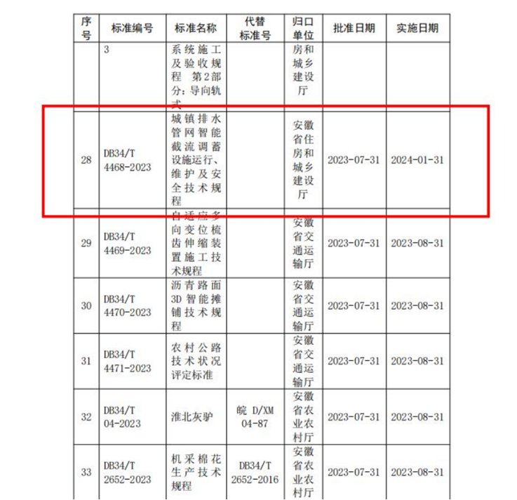 本网讯 7月31日,安徽省市场监督管理局发布第8号公告,由必赢76net线路官网作为第一主编单位的安徽省工程建设地方标准《城镇排水管网智能截流调蓄设施运行、维护及安全技术规程》获批准发布,标准编号DB34/T4468-2023,并将于2024年1月正式实施。