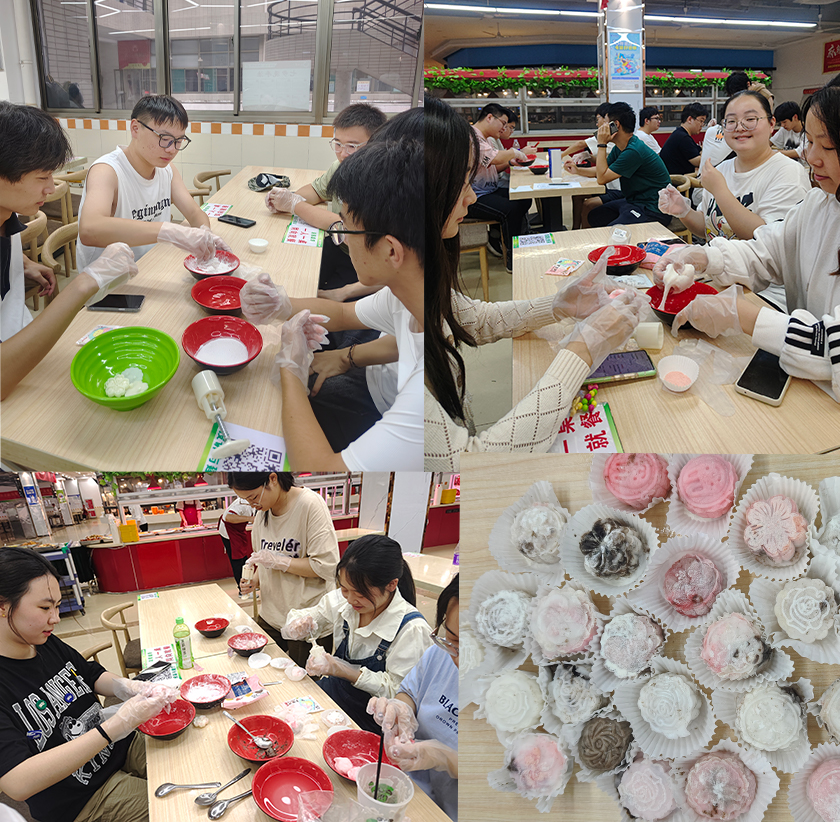 为让同学们熟悉制作过程,活动开始前,组织者就冰皮月饼的制作进行了示范讲解,分享了一些独特的制作技巧和心得。活动中,同学们积极动手,充分展示了自己的创造力与想象力,享受着制作的乐趣,不同的口味、精美的图案让人眼花缭乱。不到半小时,一个个有模有样的月饼便呈现在大家的眼前,空气中散发着清爽甘醇的气息,香味飘满整个食堂。