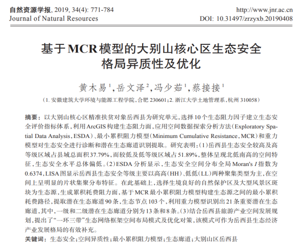 本网讯 我院资源科学系黄木易教授团队和南京师范大学方斌教授、浙江大学岳文泽教授合作发表在《自然资源学报》与《地理学报》上的论文,分别被中国科学技术信息研究所评为2021年度、2022年度“领跑者5000—中国精品科技期刊顶尖学术论文(F5000)”。其中,“基于MCR模型的大别山核心区生态安全格局异质性及优化”发表在2019年的《自然资源学报》(第34卷第4期)上,目前,据不完全统计该文下载量已达3500余次,引用率160余次;“1970-2015年大别山区生态服务价值尺度响应特征及地理探测机制”发表在2019年的《地理学报》(第2019年第74卷第9期)上,据不完全统计,论文下载量已达5000余次,引用率150余次。