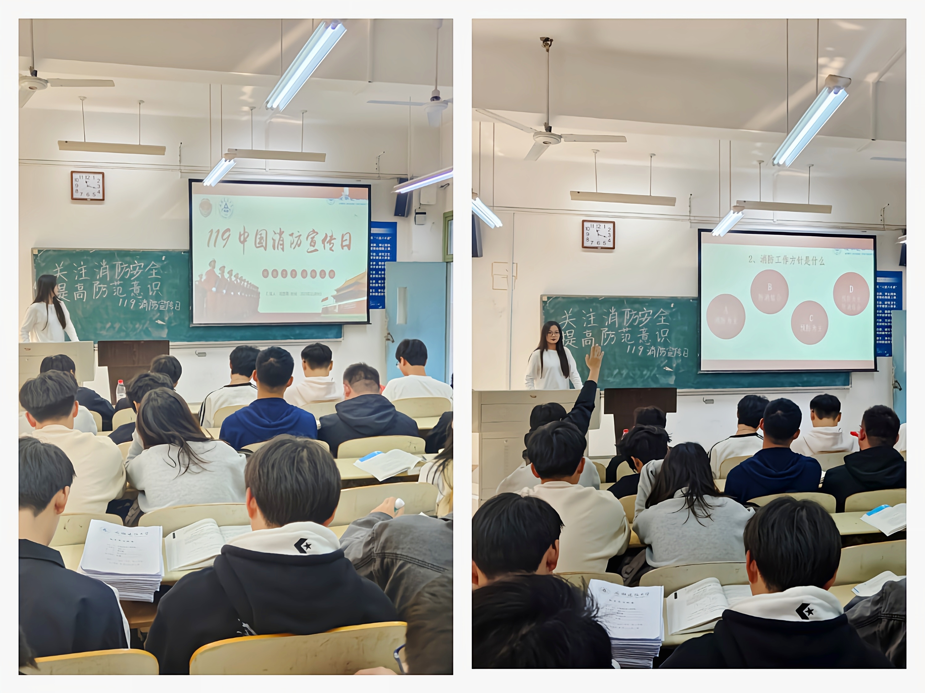 为了加强同学们的安全防火意识,有效提高同学们在火灾意外发生时的自救互救能力,活动开始前,开展了消防安全公共设施专题讲座。主持人详细介绍了火灾的基本常识、危害、原因,和如何应对不同场所、不同情况下的火灾危害,向大家传授遇到火灾危险逃生知识。在消防知识竞答环节,现场掌声与笑声不断,同学们热情高涨,积极回答主持人抛出的问题,现场气氛热烈,在欢声笑语中增加了消防安全知识。