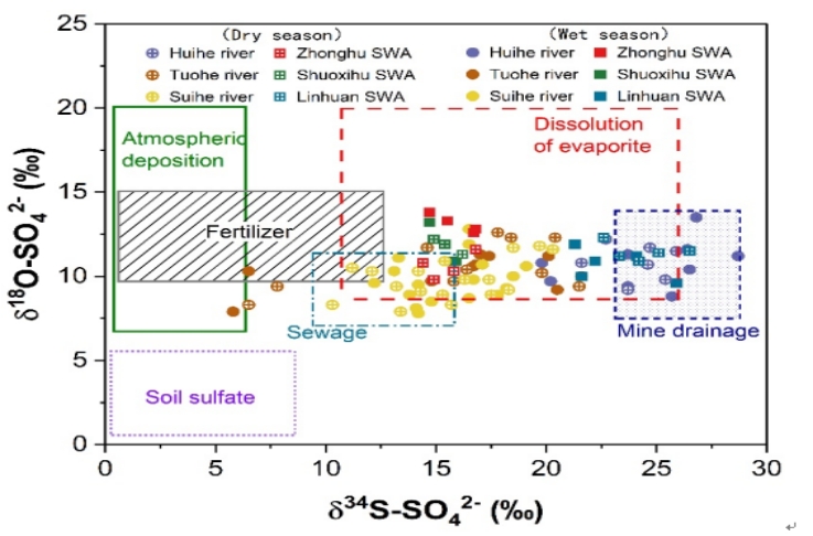 研究区旱季地表水中SO42-的总体浓度高于雨季,各种来源输入导致地表水中SO42-的富集,包括蒸发岩溶解、矿井排水、粪肥/污水和农业肥料。值得注意的是,矿井水的输入可以向河流贡献大量的SO42-,并控制其同位素组成。SO42-在地表水中的迁移转化过程相对保守,硫化物的非生物氧化和生物氧化作用相对较弱。本研究揭示了矿区周边地表水SO42-的多重来源和转化机制,为制定矿区SO42-污染的综合治理和有效修复策略提供了参考。(作者:陈星;审稿:谢发之)