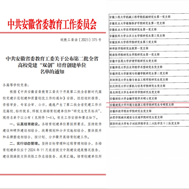 统筹推进支部标准化规范化建设。2023年,完成研究生党支部调整,新设立1个研究生党支部。学院研究生专硕党支部获批省级“双创”样板党支部建设单位,建筑环境与热能工程系教师党支部通过学校第二批“双创”培育建设基层党组织中期评估,研究生第一党支部和研究生专硕党支部通过学校党支部标准化建设达标验收。学院党委、市政工程系教师党支部、研究生第一党支部获评学校先进基层党组织荣誉称号,4人获评学校优秀共产党员荣誉称号,2人获评学校优秀党务工作者荣誉称号。