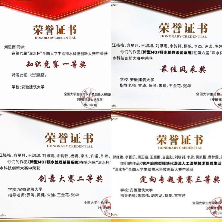 学科专业竞赛成果丰硕。2023年,学院学生获第十六届全国大学生节能减排社会实践与科技竞赛二等奖1项,第二十九届全国高等学校人工环境学科奖专业基础竞赛二等奖1项;获第八届安徽省“互联网+”创新创业大赛银奖1项,安徽省“挑战杯”银奖1项、铜奖1项,中国国际“互联网+”大学生创新创业大赛(安徽赛区)银奖2项、铜奖1项,“华骐-绿巨人杯”安徽省大学生生态环境创新创业大赛中获特等奖1项,一等奖4项;获2023年安徽省大学生GIS应用技能大赛一等奖1项,二等奖2项,三等奖2项;承办第六届“深水杯”全国大学生给排水科技创新大赛,组织参赛五个队伍,其中定向组获三等奖2项,创意组获特等奖1项、二等奖1项、三等奖1项。创新创业教育成效突出。2023年,指导开展大学生创新创业训练项目申报工作,获批国家级8项,省级30项,校级38项。
