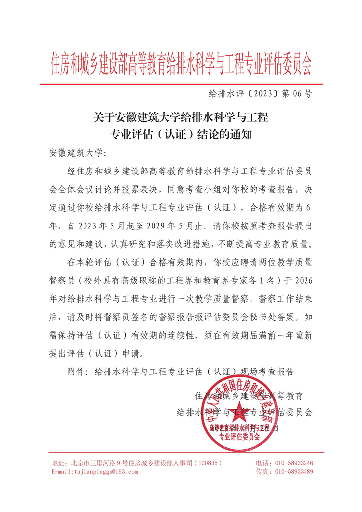 教育教学不断取得新进展。高质量完成学院本科教育教学审核评估工作,给排水科学与工程专业第四次以优异成绩通过住建部的专业复评估(认证),有效期6年;环境工程专业提交工程教育认证年度报告。完成2023版各专业培养方案的制定,完成6门国家一流课程推荐申报工作,组织教师申报省级和校级质量工程50项,推荐安徽省教学成果奖2项。获第三届全国教师教学创新大赛安徽省赛三等奖1名,校课程思政教学比赛三等奖1名,校教师硬笔字及粉笔板书比赛一等奖1名,三等奖1名。