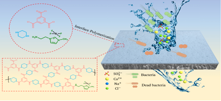 论文“Ionic liquid-functionalized antibiofouling nanofiltration membranes”通过哌嗪单体与具有抗菌特性的1-胺乙基-3-甲基咪唑四氟硼酸盐(AMIT)离子液体混合作为水相制备了一种具有抗污染性能的功能化纳滤膜。由于AMIT的杀菌特性使膜可以在细菌附着在其表面的早期阶段进行杀菌,可以有效减轻生物污染。此外,制备的膜具有更疏松的纳米多孔结构,提高了膜通量的同时保持了与原始膜相当截留性能,并且展示出优异的抗结垢性能。本研究结果为制造具有卓越防污性能的纳滤膜提供了一种简单而有效的策略。