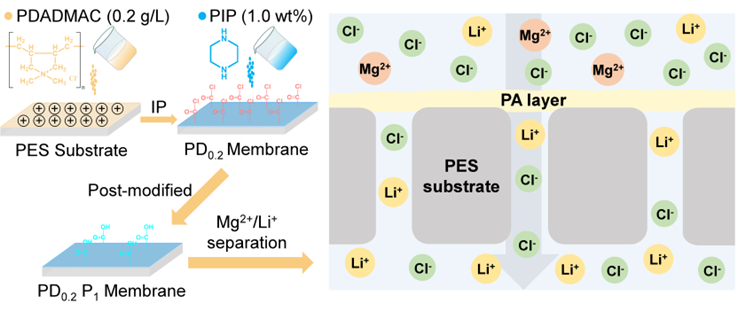 论文“Enhancing Mg2+/Li+separation performance of nanofiltration membranes through polyelectrolyte modulation and surface modification”利用聚(二甲基二烯丙基氯化铵)(PDADMAC)溶液改性了聚醚砜超滤膜基底,该溶液通常用于层层自组装制备纳滤膜。PDADMAC的亲水性和正电荷特性可以改变聚醚砜基底的表面性质,从而调控界面聚合过程导致纳滤膜活性层具有更致密的交联。同时对其活性层进行后改性处理,以消耗界面聚合过程中未反应的酰氯基团,实现膜表面负电荷的屏蔽。研究证明了制备膜在模拟盐湖卤水中,Mg2+/Li+分离因子可高达77.5,同时具有优异的稳定性和可重复利用性。 (作者:王靖军 申慧彦;审稿:谢发之)