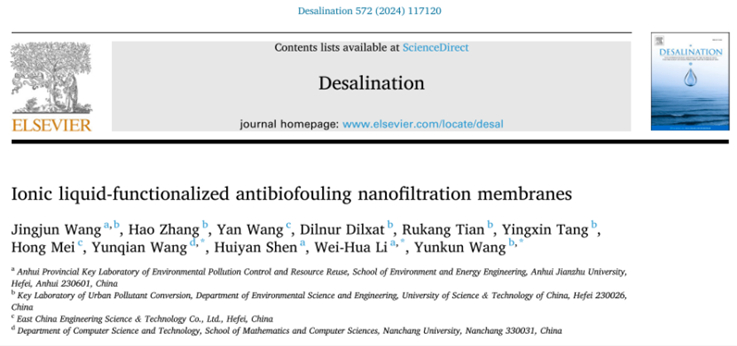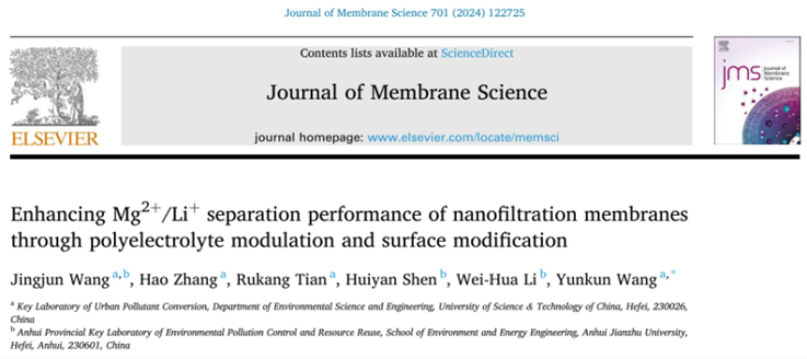 本网讯 近日,必赢环境与能源工程学院硕士研究生王靖军同学在学院申慧彦副教授和中国科学技术大学环境科学与工程系王允坤研究员的共同指导下,作为第一作者在工程化工领域权威期刊《Desalination》(中科院1区,影响因子9.9)、《Journal of Membrane Science》(中科院1区,影响因子9.5)在线发表了题为“Ionic liquid-functionalized antibiofouling nanofiltration membranes”、“Enhancing Mg2+/Li+separation performance of nanofiltration membranes through polyelectrolyte modulation and surface modification”的科研论文。