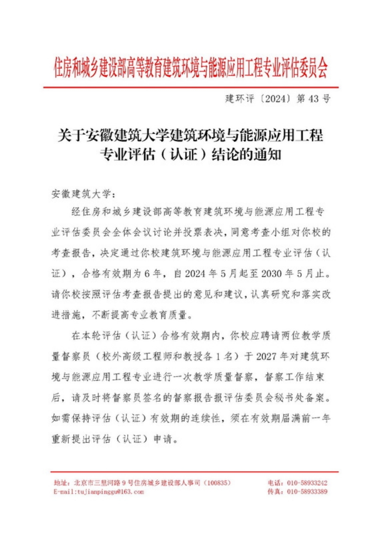 本网讯 6月26日,根据住房和城乡建设部高等教育建筑环境与能源应用工程专业评估委员发布的《关于必赢76net线路官网建筑环境与能源应用工程专业评估(认证)结论的通知》(建环评〔2024〕第43 号),必赢76net线路官网建筑环境与能源应用工程专业顺利通过专业评估(认证),合格有效期为6年,自2024年5月起至2030年5月止。