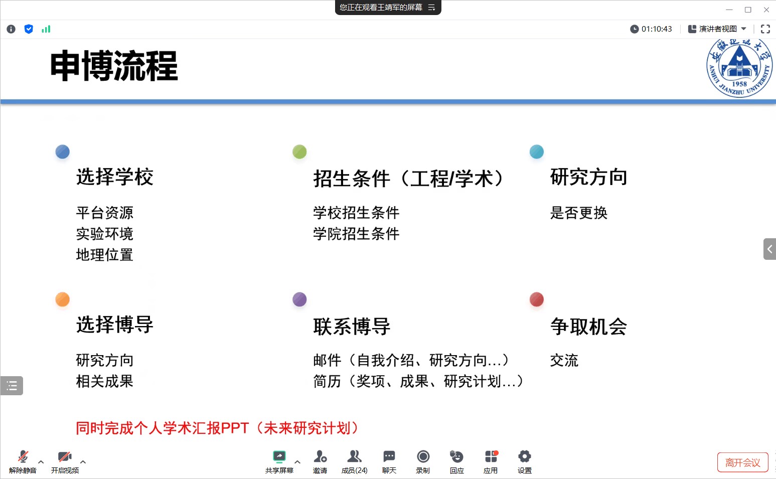 程椿同学分别从求职时间安排、求职信息掌握、简历制作以及公司笔试面试四个方面,为大家提供了宝贵经验;曾健平同学列出申博流程,详细地介绍了自己申博的筹备工作,此外还给大家分享了自己的学术论文写作技巧。王靖军同学为大家介绍了自己的学习经历和科研成果,并结合多个学校的申博条件介绍了申博流程及注意事项。这些经验分享不仅为即将面临相关选择的同学们提供了参考,也激发了他们追求更高目标的信心和动力。在互动交流环节,研究生们纷纷就自身在申博考博及就业过程中遇到的问题向学长们提问。问题涉及申请材料准备、面试技巧、职业规划等多个方面。三位同学耐心解答,不仅为提问者提供了有针对性的建议,还就一些共性问题进行了深入剖析和解答。通过此次交流会,同学们不仅收获了宝贵的经验,也对未来的深造和就业有了更加清晰的认识和规划。