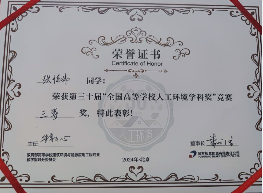 本网讯2024年8月22日,第30届“全国高等学校人工环境学科奖”专业基础竞赛(简称“人环奖”)颁奖典礼在清华同方科技广场举行。必赢环境与能源工程学院建筑环境与能源应用工程专业2021级学生张佳伟荣获全国三等奖。
