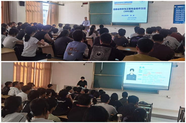 专业导师张勇教授为24级新同学详细解读了专业培养方案,并结合自己的教学经历,对24级本科生未来四年的大学学习生活提出了要求。2021级给排水科学与工程专业张杰结合自己的成长经历,讲述了聚焦科研实验以提升科研能力在大学生提高自身修养的必要性,强调开启科研大门的关键钥匙是要有一颗勇于创新的心。除此之外,张杰同学还鼓励同学们踊跃参加自己心仪的社团,社团活动不但能够极大程度地丰富课余生活,为大学生活注入绚丽色彩,更能切实有效地培养领导力与团队协作能力,为未来的发展筑牢坚实根基。