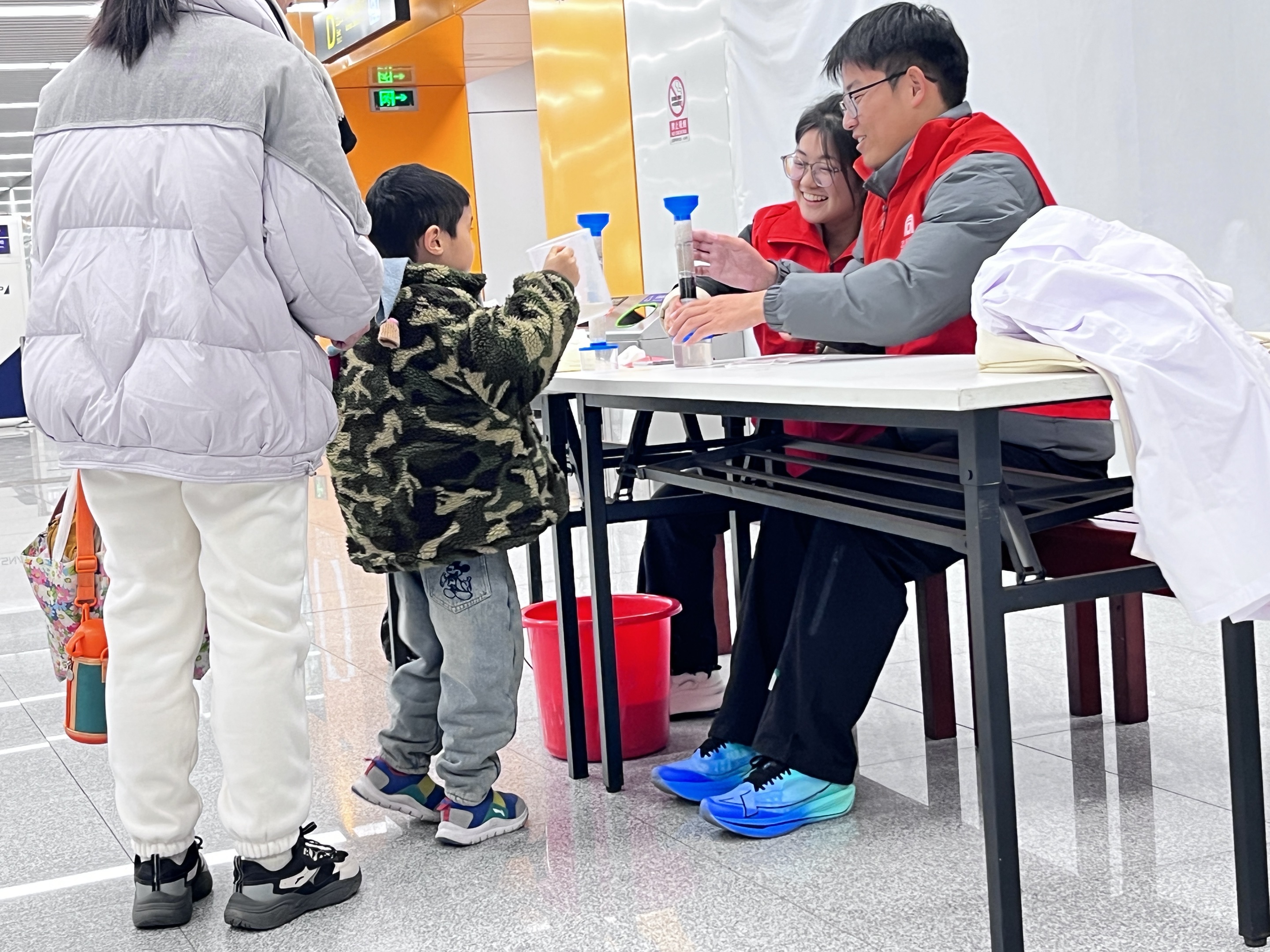 在12月28日的活动现场,给排水科学与工程专业和环境生态工程专业的学生们利用所学专业知识,为过往乘客带来了一场别开生面的污水净化实验演示。他们熟练地操作着实验仪器,有条不紊地向大家展示污水净化的过程。为了让现场的小朋友们能够更加直观、深入地理解,学生们采用了通俗易懂且充满趣味的讲解方式,将复杂的污水净化原理拆解开来,耐心地引导小朋友们观察每一个实验步骤中水质的变化,帮助孩子们探索“干净的水”究竟是如何而来。在这个充满好奇与探索的实验过程中,孩子们不仅亲眼目睹了污水变清水的奇妙转变,还学习到了许多关于水的科学知识,比如水的循环利用、水污染的危害以及水资源的珍贵性等。更为重要的是,通过这样亲身体验的方式,在孩子们幼小的心灵中悄然种下了环保意识的种子,让他们从小就懂得珍惜水资源、爱护环境。