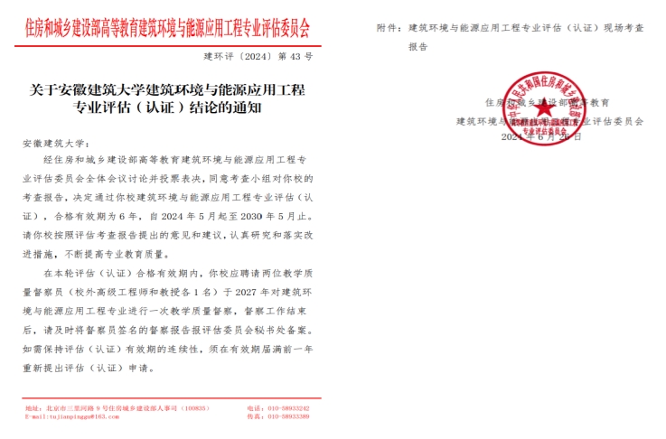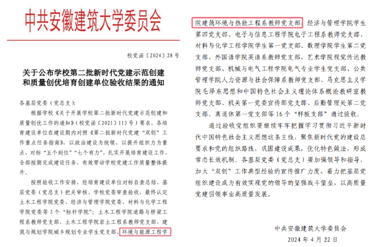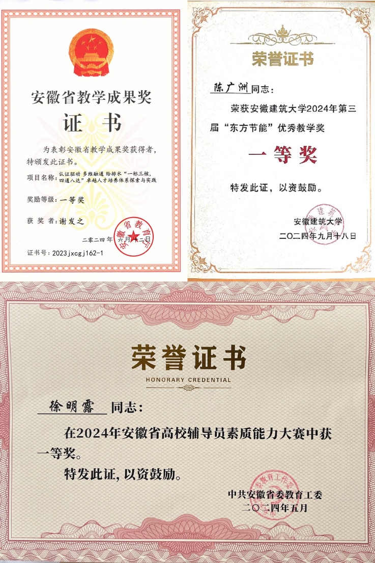 以培育教育家精神为抓手,聚焦宣传引导,强化弘扬践行,引导广大教师更加坚定为党育人、为国育才的初心使命,坚守躬耕教坛,强国有我的价值追求,把师德师风建设作为常态化、日常性基础工作,同转变工作作风、打造高效课堂、注重安全教育、做好规范管理相结合。2024年,建筑环境与能源应用工程专业接受住房和城乡建设部高等教育评估委员会专家现场考查,并通过专业评估(认证),有效期6年;《海绵城市与雨洪管理》《建筑给水排水工程》《绿色建筑》三门课程获推荐申报国家一流课程,出版《新工科专创融合教育-大学生创新创业训练与实践》等教材4部。获批省级本科教学质量工程项目22项。获安徽省教学成果奖特等奖1项,一等奖1项。学院教师在各类教育教学比赛中获得良好成绩,获第三届“东方节能”优秀教学奖一等奖1项,获2024年安徽省高校辅导员素质能力大赛一等奖1项。
