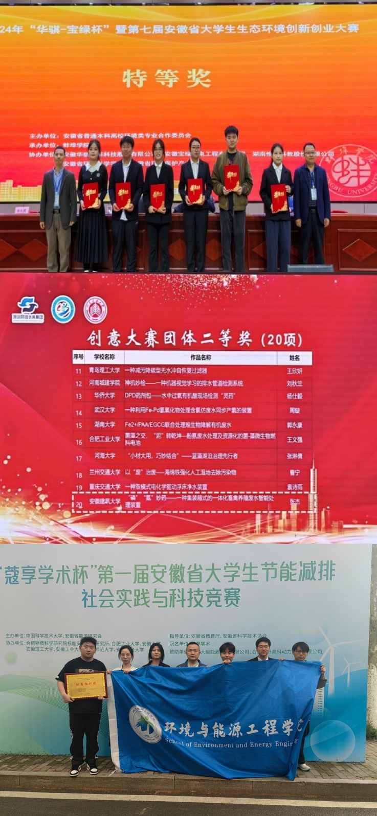坚持将立德树人落实在教育教学的各个环节,延伸到学生发展的方方面面,通过强化教育活动、树立典型榜样、加强阵地建设、完善规章制度等,持续推进学风建设,不断激发学生学习热情,增强学生成长内生动力,引导学生立报国强国大志向、做挺膺担当奋斗者。学生各级各类获奖丰硕,学院在学校运动会上成功卫冕“二十一冠”。4名学生获国家奖学金,1名学生获校“十佳大学生”,获第六届全国大学生市政环境AI+创新实践能力大赛一等奖1项,二等奖2项,三等奖7项;获省第一届大学生节能减排社会实践与科技竞赛二等奖2项,三等奖6项;第七届“深水杯”给排水科技创新大赛二等奖1项;第七届安徽省大学生生态环境创新创业大赛特等奖2项,一等奖3项,二等奖4项。
