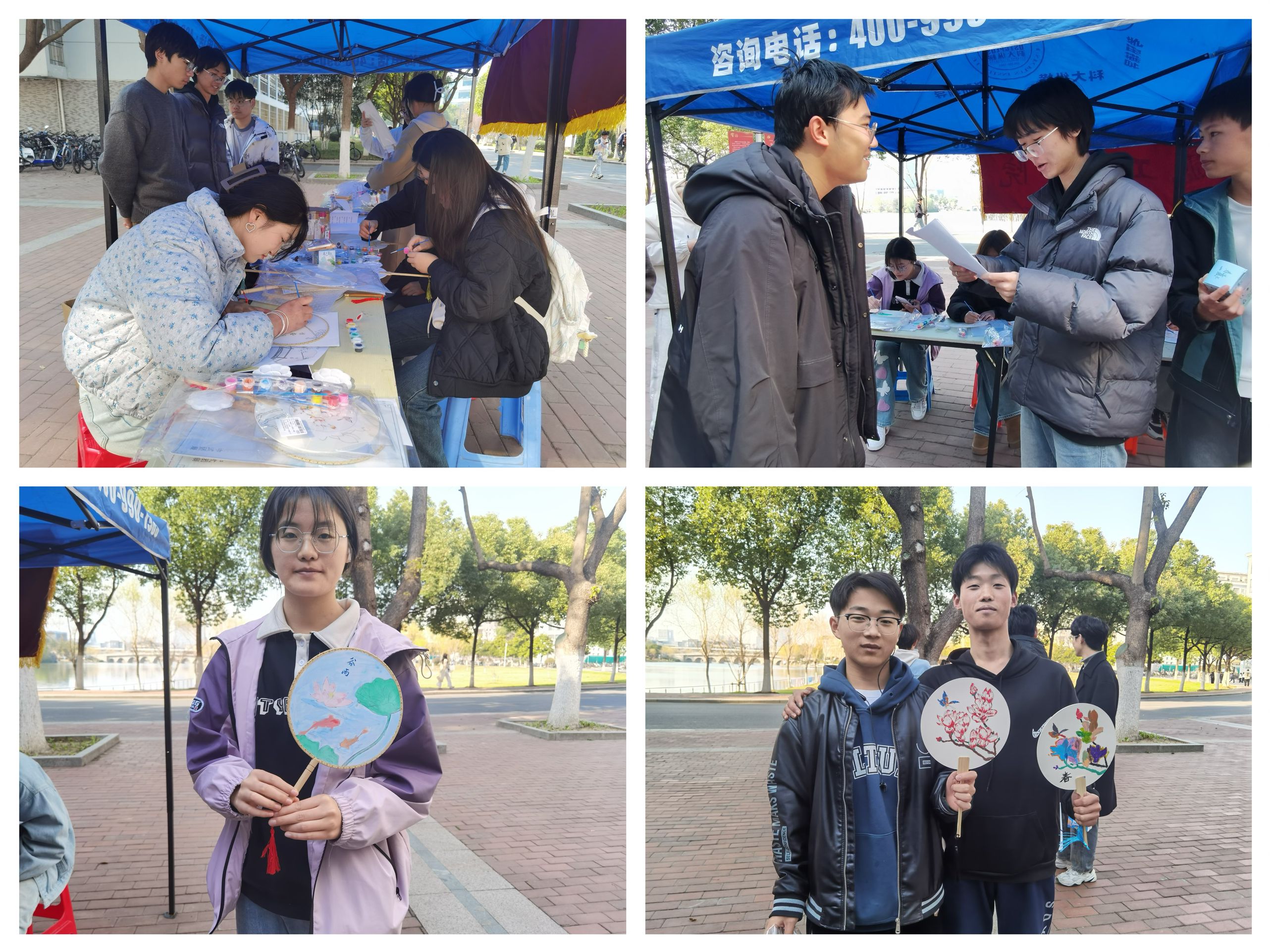 本次活动主要分为三大主题:在“节气猜猜猜”环节,同学们两两组队,默契配合,通过“天气转暖、播种插秧”等线索描述节气特征,猜出正确答案,现场不时传出“是惊蛰!”“不对,应该是谷雨”的欢快讨论。“节气排序挑战”则上演一场头脑风暴,同学们在规定时间内将打乱的节气名称按时序排列,“春雨惊春清谷天,夏满芒夏暑相连…”的节气诗在现场上空不时回荡。在另一边的非遗手作区内,空白团扇、水墨颜料与节气纹样模板供同学们自由创作,一幅幅“春分纸鸢”“白露蒹葭”主题扇面跃然纸上,成为传统文化与现代审美的生动对话。