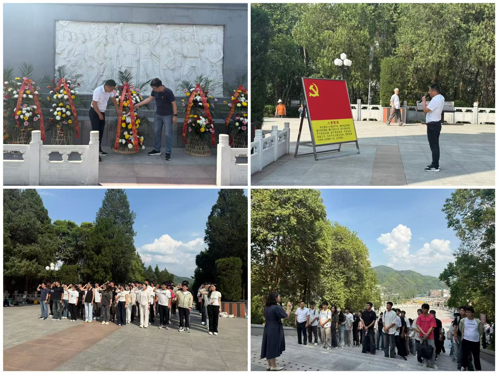 一寸山河一寸血,一抔热土一抔魂。离开大湾村,同学们来到了金寨红军广场,苍松翠柏环绕下,高耸的革命烈士纪念塔庄严肃穆,“燎原星火”四个鎏金大字在阳光下闪耀。在金寨干部学院王凤霞老师的带领下,全体同学怀着崇敬的心情,向纪念塔敬献花篮,深深三鞠躬,重温入党誓词,寄托对革命先烈的无限哀思。