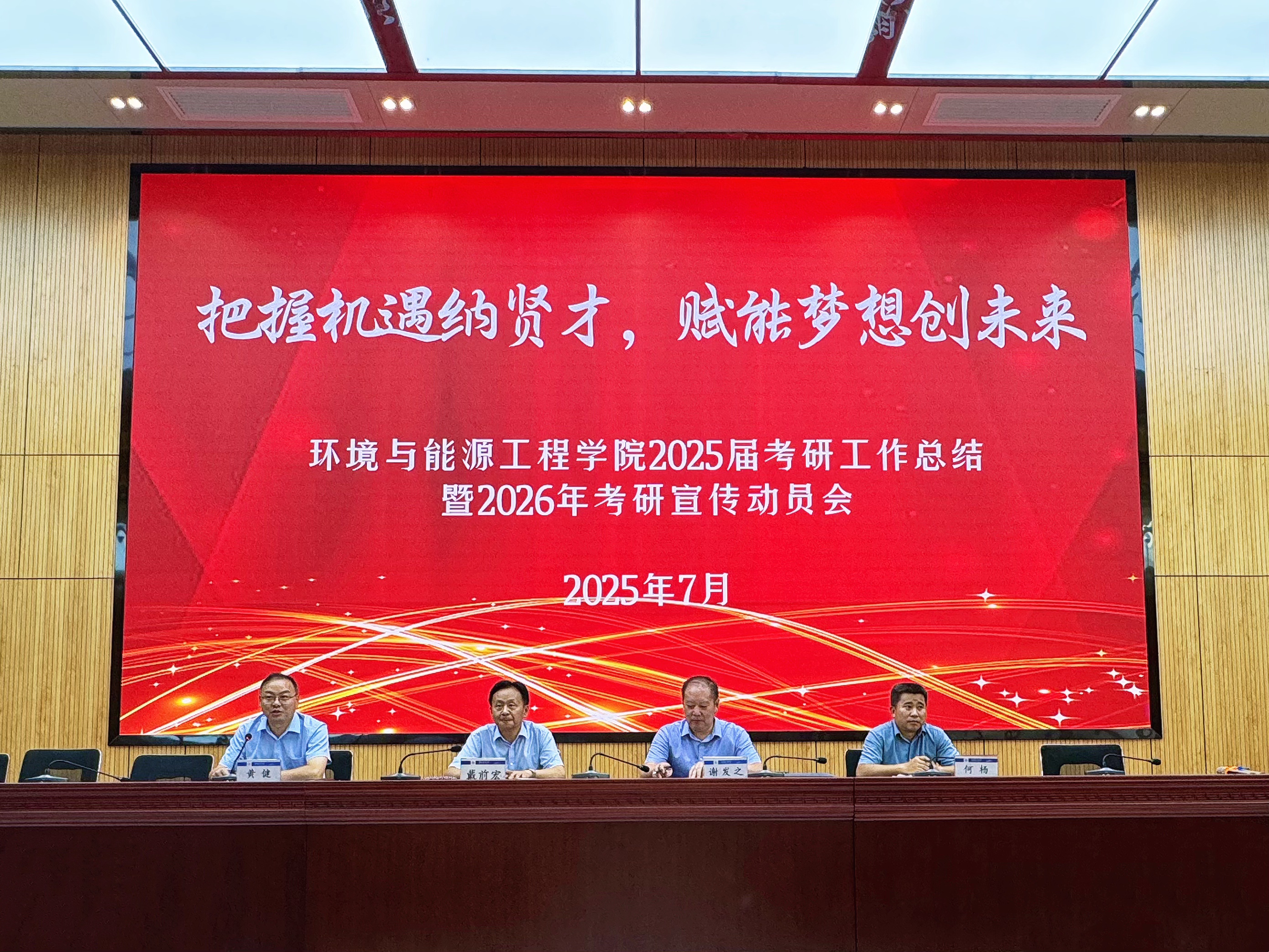 本网讯 环境与能源工程学院2025届考研工作总结暨2026年考研宣传动员会于7月18日在徽韵楼二楼报告厅召开。会议由副院长黄健主持,学院领导、导师代表、各系主任、相关教务、学工老师以及备考2026年研究生入学考试的在校生近二百人参会。