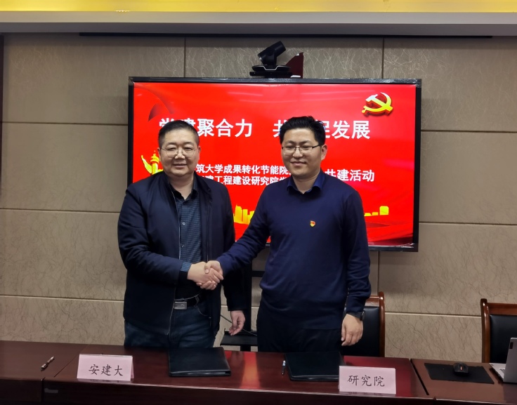 会上,安徽三建工程建设研究院党支部书记、院长陈雷及成果转化节能院党支部书记仲勇分别介绍各自支部党建工作及业务工作的基本情况;双方就支部共建形式、共建措施进行了深入探讨,签订了《推进成果转化、深化一改两为》支部共建协议。
