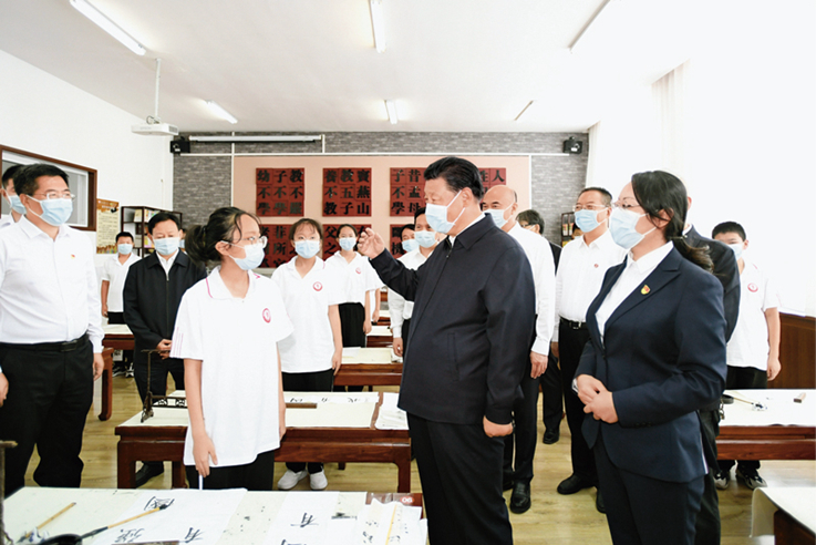 2021年9月13日至14日,中共中央总书记、国家主席、中央军委主席习近平在陕西省榆林市考察。这是14日上午,习近平在绥德实验中学考察时,同正在练习书法的学生亲切交流。