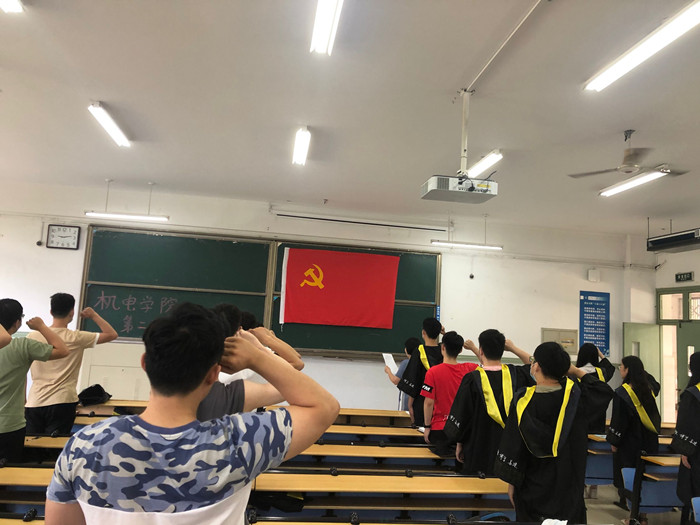 首先,师生全体起立奏唱国歌,然后,全体党员一起重温入党誓词。重温入党誓词,重温当年的决心和信念,在这个即将毕业的时刻,是对初心的坚持,更是对毕业班党员的鞭策和激励。