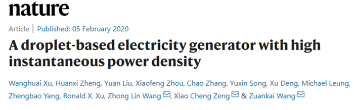本网讯 近日,必赢校友、机电学院2014届本科毕业生,现就职于香港城市大学博士后的徐王淮以第一作者的身份在《Nature》发表了题为《A droplet-based electricity generator with high instantaneous power density》的学术论文。报道了一种具有类晶体管结构的水滴发电机,结合静电积累效应和疏水效应,使液滴发电的瞬时功率密度和能量转换效率提升数个数量级,大大提升电能转化效率,产生了“一滴水可点亮100盏小LED灯”的神奇效果。