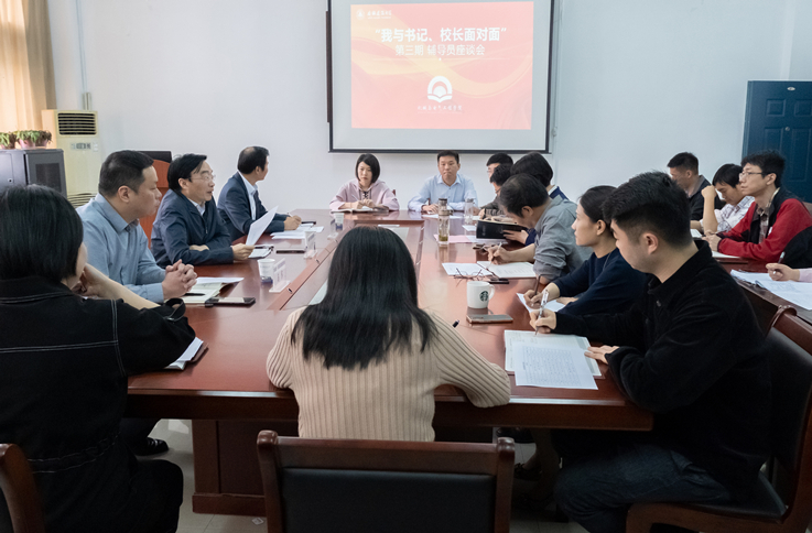 11名专兼职辅导员围绕疫情防控下辅导员工作的重点难点问题与孙道胜书记进行探讨和交流,学工办主任江侠就辅导员专业化、职业化、专家化的发展问题;团委书记王柏涛就专业导师育人作用的发挥、辅导员工作室的建立问题;刘云就辅导员心理健康建设问题;杨慧就辅导员成长发展和职务职级晋升问题;侯亚伟就职称评聘问题;吴汉平就辅导员编制落实问题;刘翔宇就学生工作智慧化、信息化建设,运用大数据服务学生工作等相关问题进行深入交流,孙道胜认真听取辅导员工作的经验、困惑和建议,并一一作出回复,会场气氛热烈欢快。