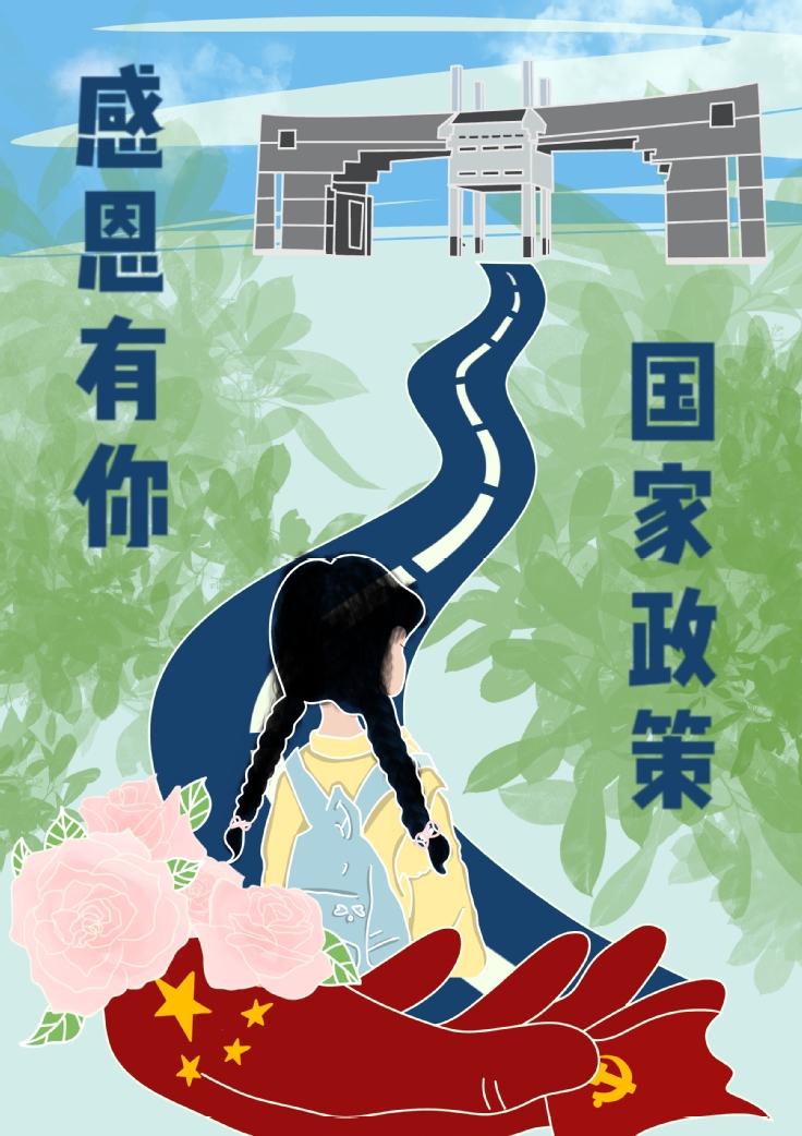 感恩国家的学生资助政策,学生免息贷款,助学金等,为贫困生解决后顾之忧,圆大学梦。画面下方的手代表着国家,手中拿着党旗,党与国家是我们坚强的后盾,手捧少女,助她走向大学。