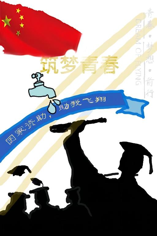感恩在国家的政策帮助下,学子们可以放飞青春,顺利渡过大学生活,画中,国家犹如水龙头般,一点一滴,帮助学子毕业,得已筑梦青春。