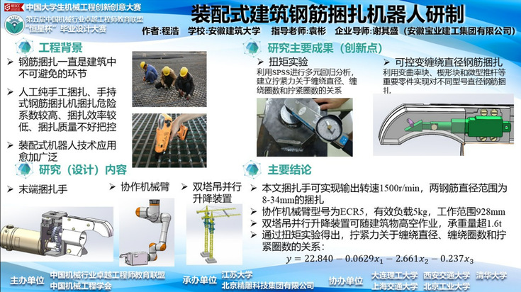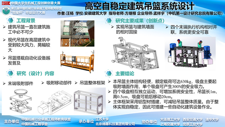 程浩同学的参赛作品《装配式建筑钢筋捆扎机器人研制》,用升降式钢筋捆扎机械臂为辅助,多功能多维度捆扎手为主体,进行了有关松紧程度的扭矩实验,主要解决装配式钢筋捆扎中高层捆扎、可变半径捆扎和多维捆扎等难题。汪杨同学的参赛作品《高空自稳定建筑吊篮系统设计》,用吸盘结构作为最终的执行机构,模组和升降台多维度控制吸盘吸附墙面位置,铝型材快速搭建吊篮框架,主要解决了高空吊篮的稳定安全性以及吊篮快速搭建的难题,为后期实现吊篮的自动化作业打下基础。