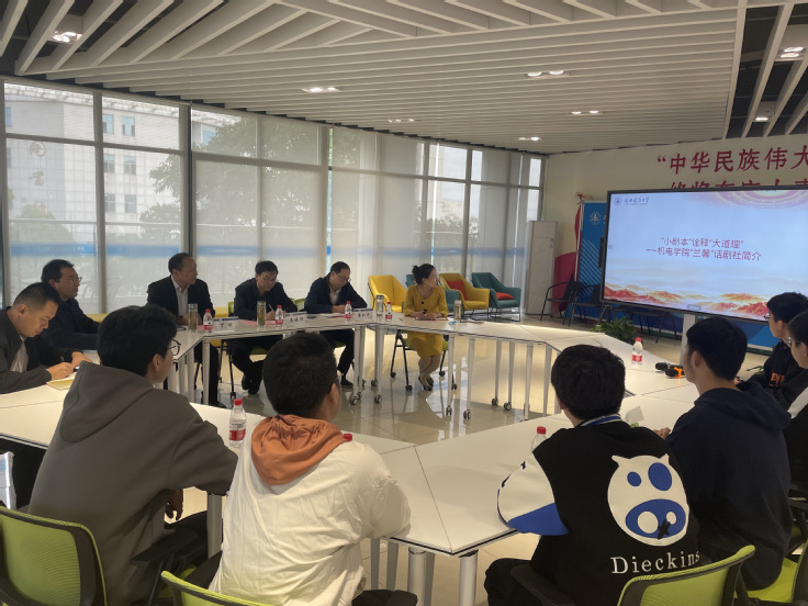 在易班发展中心,吴运传一行与机电学院“兰馨”话剧社社员进行沟通交流。学院党委副书记何鹤立汇报了社团建设情况,各位领导与社团成员进行详细交流,并就党建与社团发展融合、话剧选题、品牌影响力提升提出宝贵意见。