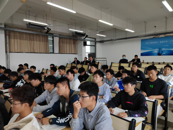 吴运传一行首先走进逸夫楼5404教室,旁听了毛亚岐老师的《画法几何与机械制图》课程,在听课过程中各位领导边听边关注课堂状况,课堂上教师上课有激情,学生听课认真,精神饱满。