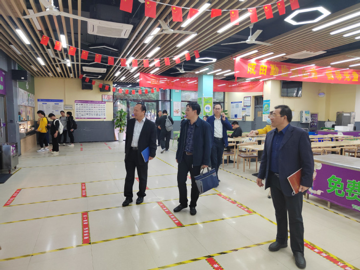 最后,吴运传一行来到食堂,查看了学生食堂现场管理各项工作,对食堂内外环境保洁消毒、餐厅入口体温检测、餐具消毒、员工服务操作规范及饭菜质量等进行了全面检查。