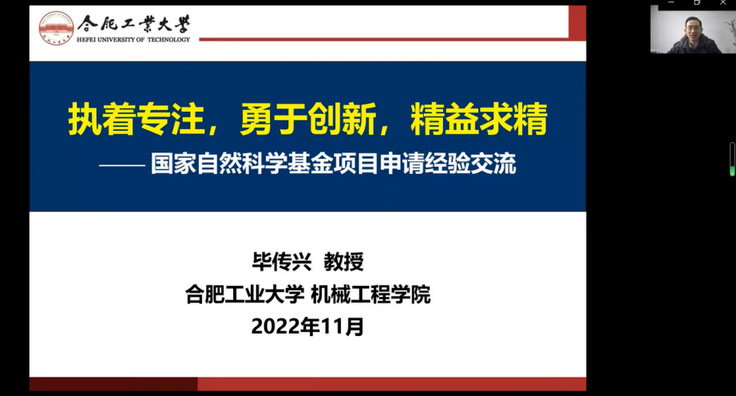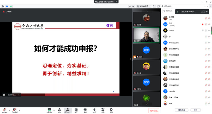 本网讯 近日,机电学院邀请合肥工业大学“斛兵学者”特聘教授、国家自然科学基金优秀青年科学基金获得者毕传兴教授做国家自然科学基金申报线上专题辅导。副院长陈中主持交流会,学院副高职称以上教师、青年博士、研究生约150人参加交流会。