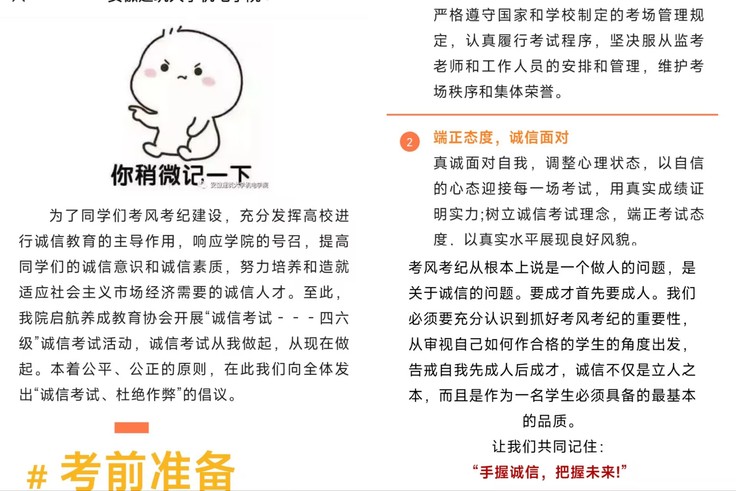 线上动员广宣传。学院通过微信公众号新媒体网络平台,推送诚信考试相关知识,倡导文明诚信考试和科学备考,引导学生们以积极的心态复习,诚信应试。