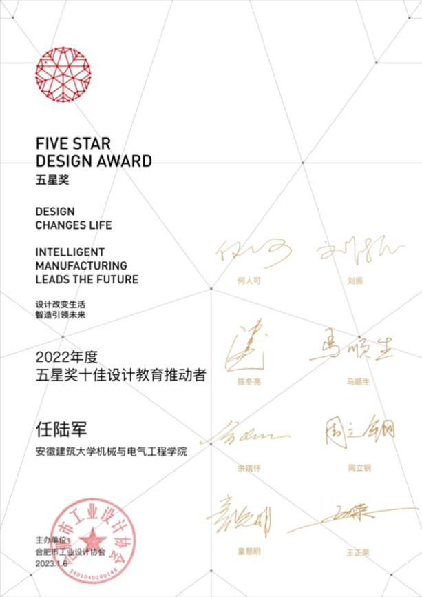 本网讯 2023年1月6日,由安徽省经济和信息化厅指导、合肥市工业设计协会主办的2022年度五星奖十佳工业设计奖揭晓,机电学院工业设计系教师任陆军喜获五星奖十佳设计教育推动者。