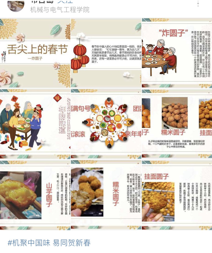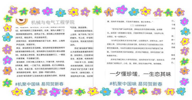 本网讯 汪曾祺先生言:“四方食事,不过一碗人间烟火。”人间烟火味,最抚凡人心。机电学院易班工作站举办第一届“机聚中国味,易同贺新春”主题征集活动,鼓励大学生用文字畅谈历史悠久的饮食文化,用画笔绘制精美诱人的餐桌美食,用镜头定格年夜饭时阖家团圆的幸福美满,用温暖的食物讲述中国优秀的文化传统,讲述有人情温度的身边故事,过好有滋有味的中国年。