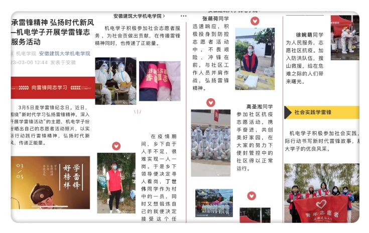 线上网络聚力,弘扬雷锋文化。学院秉承“雷锋在线,再现雷锋”的理念,以讲好雷锋故事、研究雷锋文化为目标,易班平台通过“机电‘易’起看——雷锋故事共了解”板块推送雷锋生平、雷锋日记和雷锋先进事迹,突出知识性和时代性,形成学雷锋主题教育和网络育人相融合的育人格局。